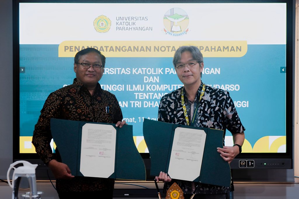 The MoU signing was conducted by UNPAR’s Rector, Prof. Tri Basuki Joewono, Ph.D., represented by UNPAR’s Vice Rector for Academic and Student Affairs, Dr. Henky Muljana, S.T., M.Eng, and STIKOM Yos Sudarso’s Chairman, Romanus Edy Prabowo, S.Si., M.Sc., Ph.D.